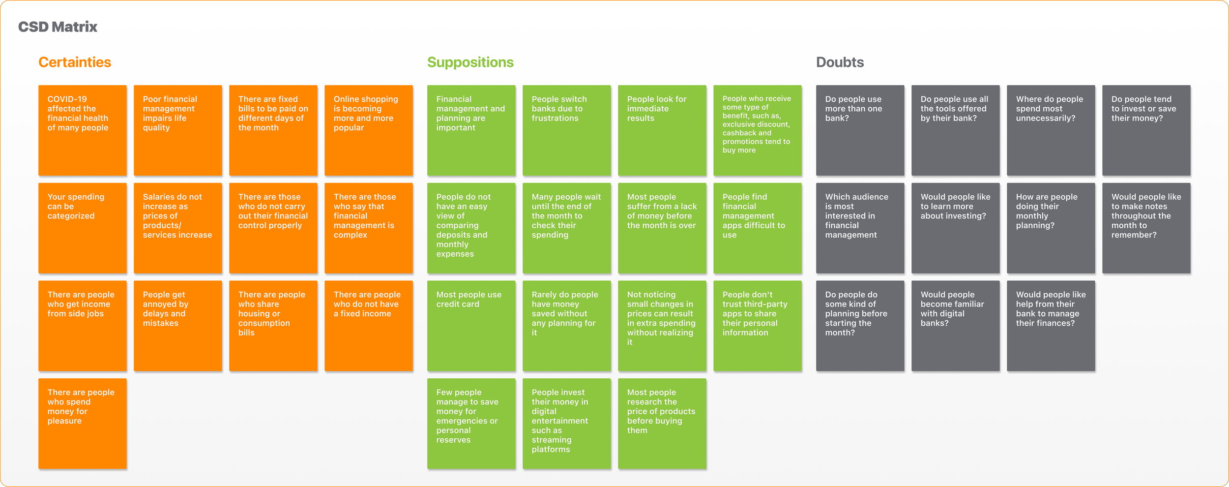 After defining the personas and their journeys, we used the CSD matrix to list certainties, assumptions, and doubts. Then, we prioritized these last two with the help of the impact vs knowledge matrix and developed hypotheses that served as a basis for designing our initial quantitative research questions.